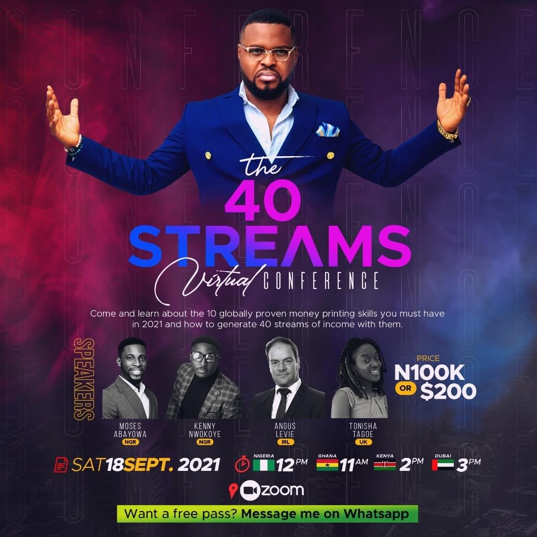 Join Amazing Speakers This Saturday As They Share With You 10 GLOBALLY PROVEN MONEY PRINTING SKILLS THAT CAN GENERATE OVER 40 STREAMS OF INCOME FOR YOU!...